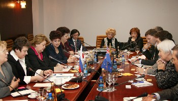 В беседе принимали участие с российской стороны женщины сенаторы Валентина Петренко, Людмила Нарусова, Зинаида Драгункина, Наталия Дементьева, Галина Буслова, Нина Ткачева, Лариса Пономарева. |